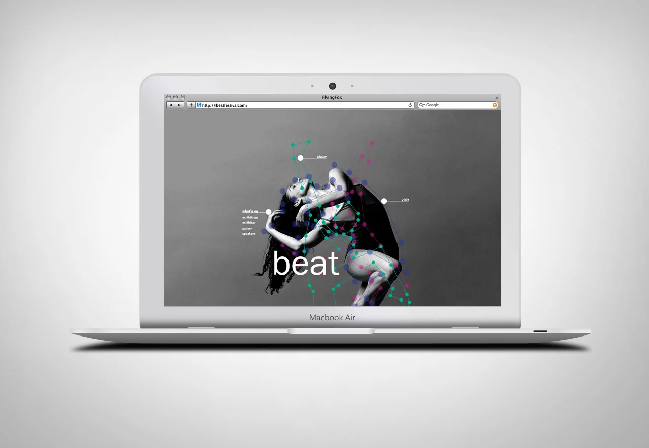The identity created for the Beat Sound Art Festival came from the idea that beats can in fact be made from movement. The inspiration came from Mikhail Baryshnikov's Human Beat Box dance performance, where he was linked to a contraption that amplified his cardiac activity. The only "music" that the audience heard was Mikhail's heartbeat. As he danced, his heartbeat fluctuated depending on the speed of his movement, which in turn influenced his improvised dance. And there you have it. Movement in fact can create a beat.
